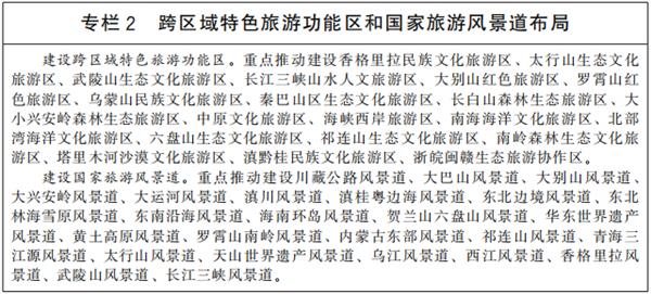综合考虑文脉、地脉、水脉、交通干线和国家重大发展战略,统筹生态安全和旅游业发展,以长城、大运河、长征、黄河国家文化公园和丝绸之路旅游带、长江国际黄金旅游带、沿海黄金旅游带、京哈—京港澳高铁沿线、太行山—武陵山、万里茶道等为依托,构建“点状辐射、带状串联、网状协同”的全国旅游空间新格局。健全京津冀协同发展、长江经济带发展、粤港澳大湾区建设、长三角一体化发展、黄河流域生态保护和高质量发展等区域重大战略旅游协调机制,推进跨行政区域旅游资源整合利用。加强区域旅游品牌和服务整合,支持京张体育文化旅游带、黄河文化旅游带、巴蜀文化旅游走廊、杭黄自然生态和文化旅游廊道、太行山区等旅游发展。持续推进跨区域特色旅游功能区建设。继续推出一批国家旅游风景道和自驾游精品线路,打造一批世界级、国家级旅游线路。鼓励各地区因地制宜实现差异化发展。