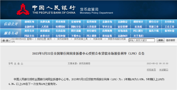 首先来看央行方面的消息:今日上午,中国人民银行授权全国银行间同业拆借中心公布,5月22日贷款市场报价利率(LPR)为:1年期LPR为3.65%,5年期以上LPR为4.3%。以上LPR在下一次发布LPR之前有效。