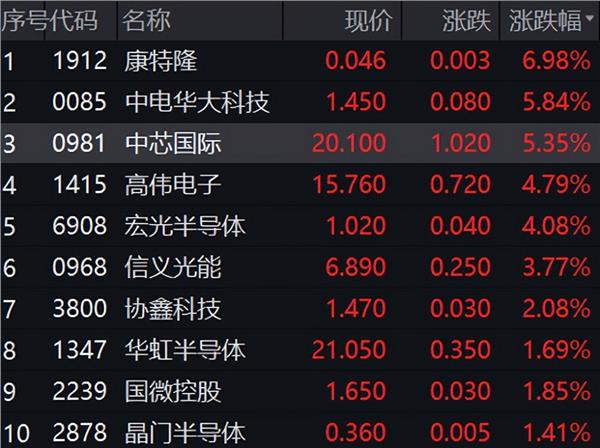港股市场上,半导体概念同样走高,中芯国际涨超6%,康特隆、高伟电子、信义光能、协鑫科技、华虹半导体等涨幅居前。