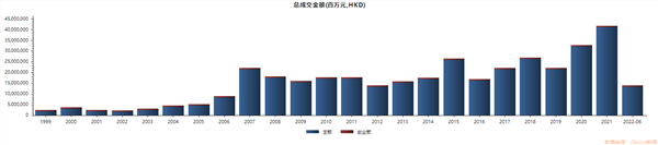 从年总成交额来看,港股市场从此前的1.91万亿港元,升至2021年的41.1万亿港元,增长幅度超20倍之多。