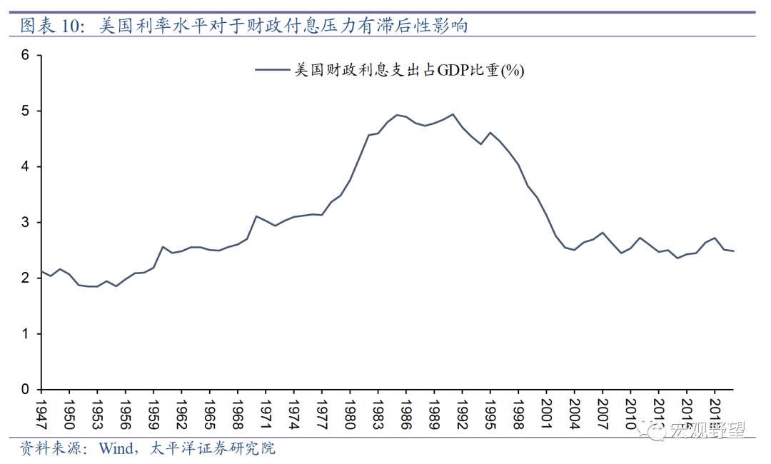 从美国历史经验来看,货币政策通常比财政政策更容易“妥协”。美国财政预算需要国会两院和白宫共同决定,通常博弈较为激烈。历届政府也大多不愿在自己的任期内实施大规模的财政紧缩。美国国会预算办公室(CBO)每年都会发布未来的政府债务率预测。对比2010年CBO发布的财政预算报告,可以看出10年来美国实际债务率的增长基本是按照当年最快的假设路径来发展的。这也反映出美国财政紧缩的阻力确实较大。所以,在极高的政府债务率的背景下,美联储的货币政策实际上面临很大的压力,尤其是这一压力会滞后发生,需要提前应对。因此我们认为美联储货币政策的空间已经不大,可能在一季度两次加息之后,就会终止加息周期。