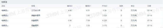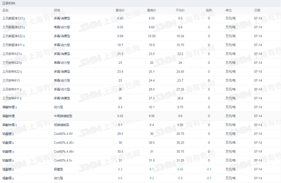 根据上海有色网数据,截至7月13日,电池级碳酸锂均价30.45万元/吨,工业级碳酸锂均价29.1万元/吨;电池级氢氧化锂(56.5%国产粗颗粒)均价28万元/吨,工业级氢氧化锂均价25.9万元/吨。三元材料方面,523多晶、523单晶、622多晶、811多晶(动力型)均价分别报每吨22.5,24,24.45,27.25万元。