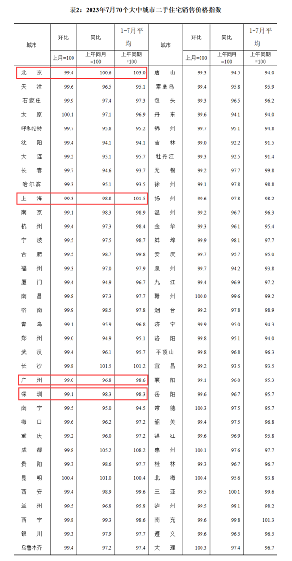 从新建商品住宅看,7月份,一线城市新建商品住宅销售价格环比连续两月持平,其中北京和上海环比分别上涨0.4%和0.2%,广州和深圳环比分别下降0.2%和0.6%。
