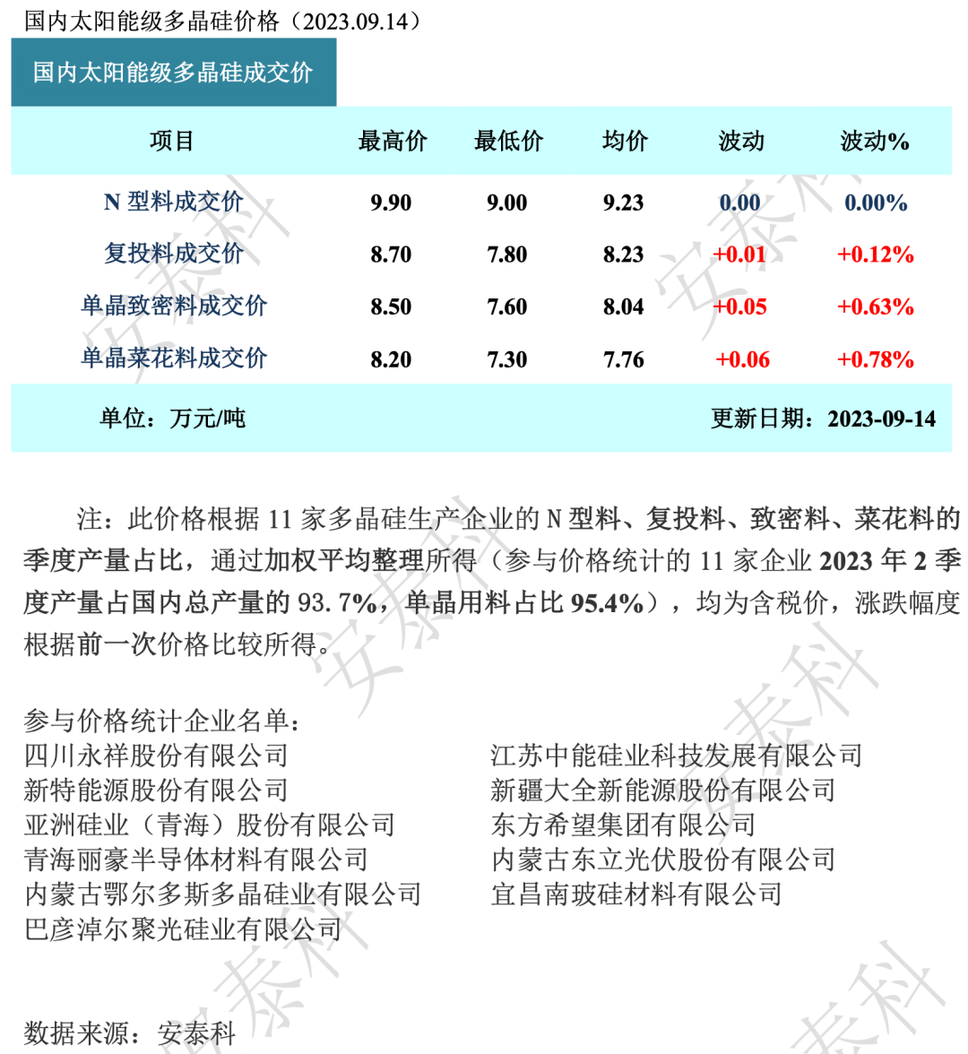 价格方面,由于供应量增加缓慢,订单履约情况参差不齐,新签订单价格保持微幅上涨形势,包括二线企业在内价格范围涨至每公斤78-89元范围。硅料企业的九月订单基本完成签售,个别企业订单履约期覆盖到十月上旬。