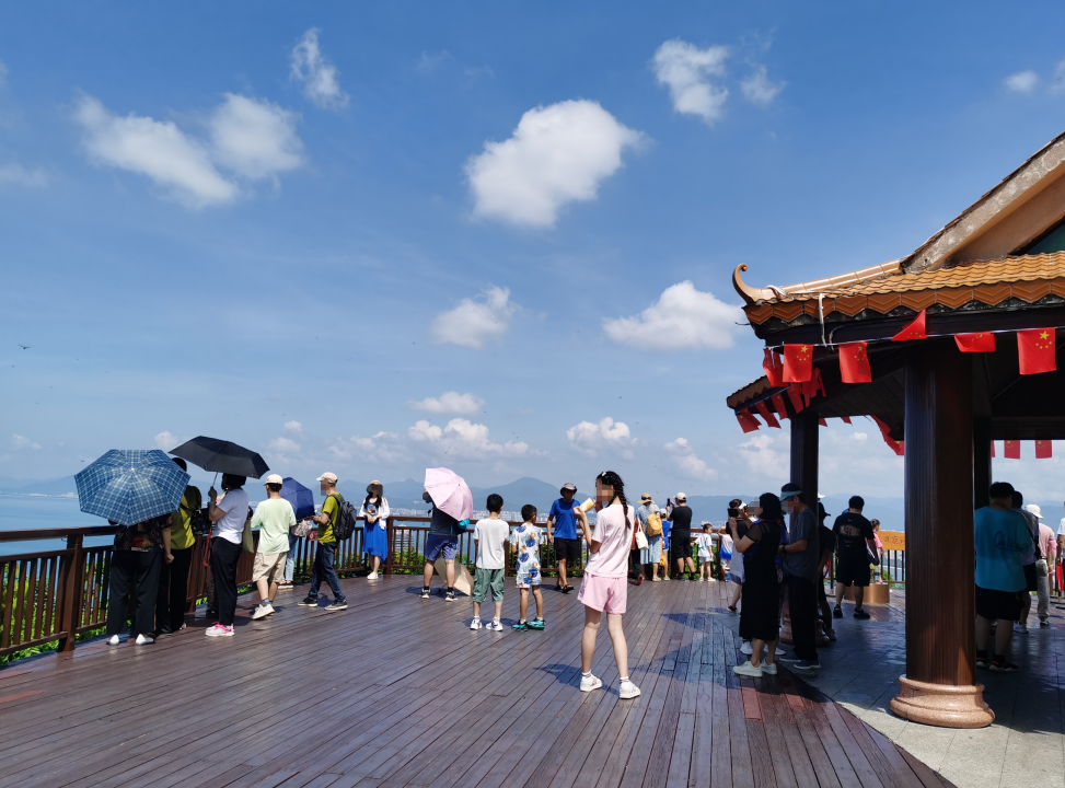 登上最高的观景平台,视野开阔可以将三亚城区景色尽收眼底,引来很多游客驻足留影,“我们如此热爱三亚”。