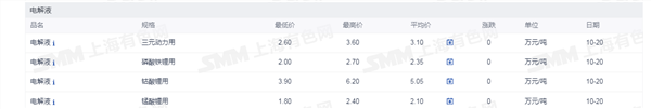 证券之星新能源车行业周报:据上海有色网,截止10月20日,电池级碳酸锂16.70- 17.80万元/吨,均价17.25万元/吨,环比上一工作日下滑0.1万元/吨;工业级碳酸锂16.0-16.7万元/吨,均价16.35万元/吨,环比上一工作日下滑0.1万元/吨。近期锂盐价格走势逐渐趋弱,整体看,当前产业链上下游的僵持行情仍在持续,下游实际需求低迷,对高价锂盐依旧持一种不备、不采的态度,市场整体零单成交较为清淡。而部分厂商在这种情况下,报价下行,市场重心逐步下行,锂盐价格转跌。