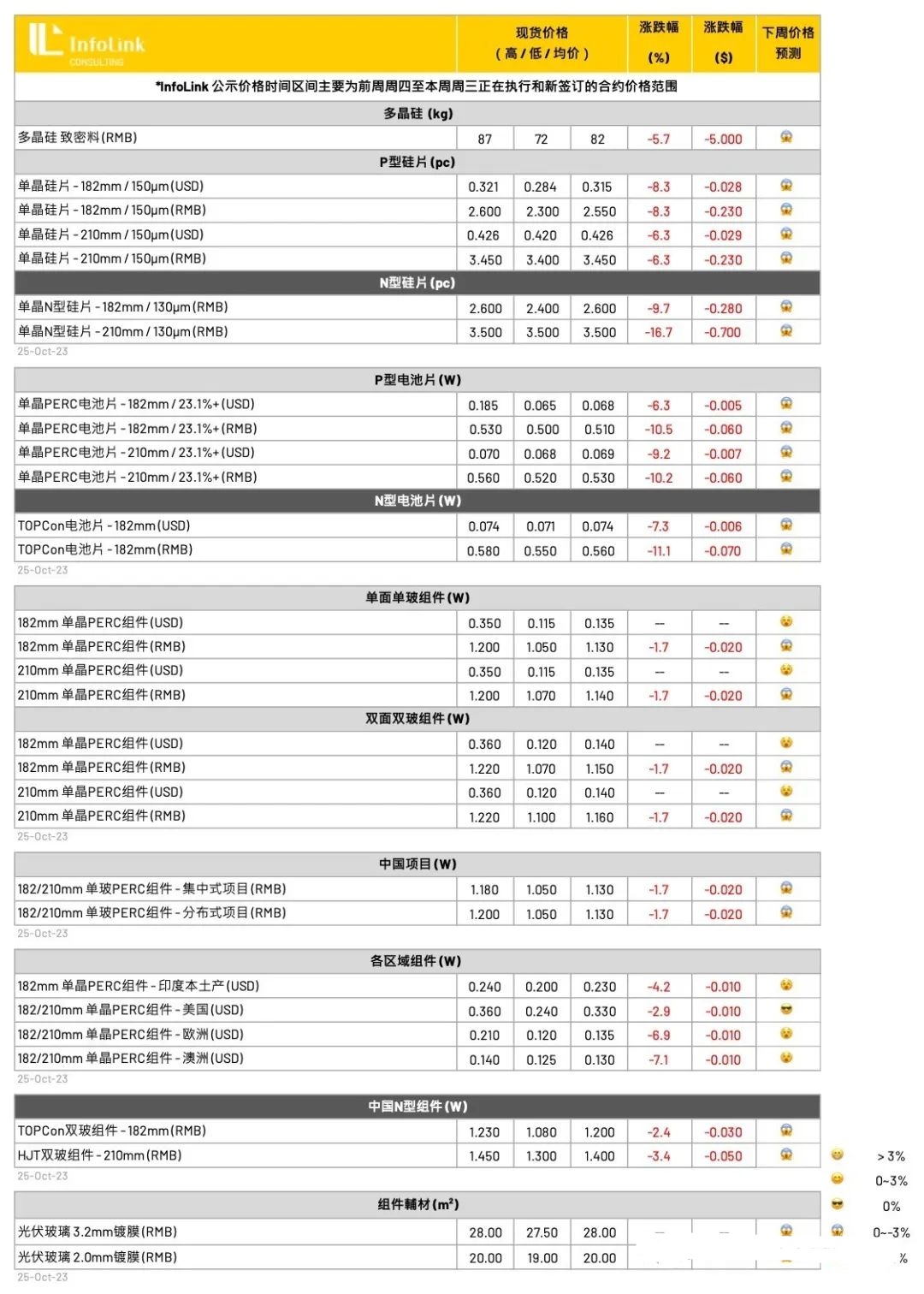 月末月初为企业集中签单期,目前大部分企业的前期订单到10月末将全部执行完毕,本周企业开始谈判11月订单。根据硅料生产企业价格谈判情况与下游企业反馈,预计新一轮成交五家一线大厂N型硅料价格将在7.7-8.0万元/吨附近达到平衡,P型复投料将在7.0-7.3万元/吨达到平衡,其余厂家的价格则有进一步松动的可能。