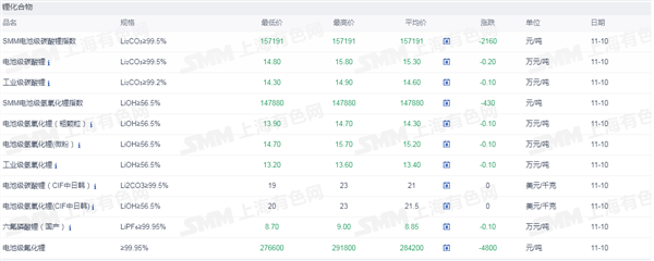 证券之星新能源车行业周报:据上海有色网,截止11月10日,电池级碳酸锂14.8-15.8万元/吨,均价15.3万元/吨,环比上一工作日下滑0.2万元/吨;工业级碳酸锂14.3-14.9万元/吨,均价14.6万元/吨,环比上一工作日下滑0.1万元/吨。上游锂盐企业更多以长单出售为主,挺价心态依旧,但个别锂盐企业随行就市小幅下调出售价格,下游正极材料企业出于降本增效策略,其散单拿货情绪也依旧低迷,近期碳酸锂现货市场成交价格仍呈现下行趋势。