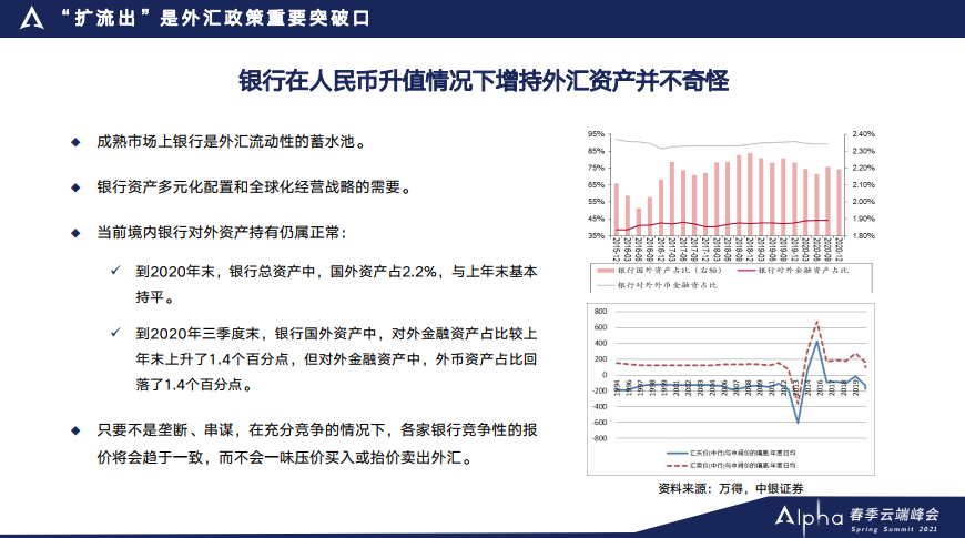 此外,银行持不持有外汇资产,它不取决于汇率预期,银行本身有资产多元化配置和全球化经营战略的考虑。其次我们可以看到到目前为止,中资的银行对外资产的持有仍然属于正常状态。到今年到去年年末的话,银行总资产里国外资产的占比2.2%,和上一年的相比是基本持平的。到去年的三季度末,银行的国外资产里头对外金融资产占比比上一年上升了1.4%,在对外金融资产里头外币资产的占比回落了1.4%,并没有什么异常的变化。