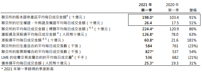 香港交易所的业务在 2021 年初开局良好,首季收入及其他收益和溢利均创新高。新股市场热闹非凡,二级市场成交量强劲,期内平均每日成交金额及沪深港通交易额均创季度新高。