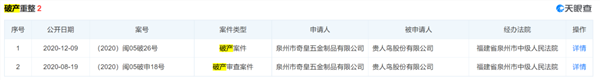 天眼查显示,贵人鸟去年两度破产重整案件。