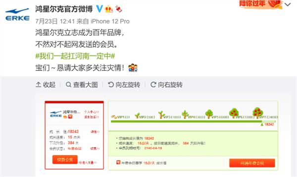 与此同时,在捐款5000万物资后,网友才发现,鸿星尔克公众号连微博会员都没充,于是,网友纷纷慷慨解囊,现在,鸿星尔克被网友送了120年微博会员。会员的截至时间到了2140年。