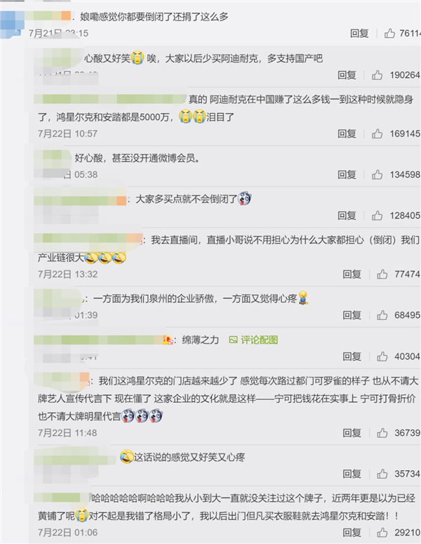 值得注意的是,鸿星尔克近几年来淡出了大众视野,不少网友以为鸿星尔克快“倒闭”了。如今却在这次危机时默默地捐了笔大款,一下子就让大批网友破防了!