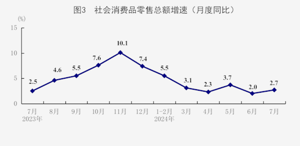 7月份,社会消费品零售总额37757亿元,同比增长2.7%,比上月加快0.7个百分点;环比增长0.35%。按经营单位所在地分,城镇消费品零售额32691亿元,同比增长2.4%;乡村消费品零售额5066亿元,增长4.6%。按消费类型分,商品零售额33354亿元,增长2.7%;餐饮收入4403亿元,增长3.0%。基本生活类商品销售较好,限额以上单位粮油、食品类,饮料类商品零售额分别增长9.9%、6.1%。部分升级类商品销售增长较快,限额以上单位通讯器材类,体育、娱乐用品类商品零售额分别增长12.7%、10.7%。1-7月份,社会消费品零售总额273726亿元,同比增长3.5%。全国网上零售额83784亿元,同比增长9.5%。其中,实物商品网上零售额70093亿元,增长8.7%,占社会消费品零售总额的比重为25.6%。1-7月份,服务零售额同比增长7.2%。
