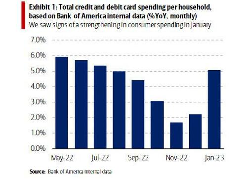 根据美国银行分析师Aditya Bhave最新公布的报告,美银统计发现,平均每个家庭的信用卡和借记卡消费总额1月份同比增长了5.1% ,创下了2022年夏季以来的最大同比增速。
