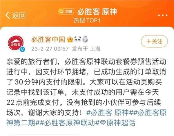 2月27日,必胜客与《原神》的二次联动,让自家必胜客APP又崩了,该话题一度冲上热搜榜第一名。此前,必胜客中国方面通过社交媒体回应称:必胜客原神联动套餐券预售活动进行中,因支付环节拥堵,已成功生成的订单取消了30分钟内支付的限制。大家可以在活动页购买记录中找到该订单,未支付成功的用户需在当天22点前完成支付;没有抢到的小伙伴可参与后续场次。