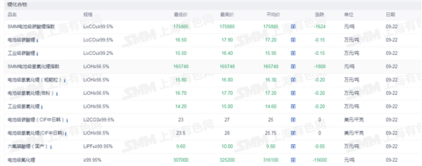 证券之星新能源车行业周报:据上海有色网,截止9月22日,电池级碳酸锂16.5-17.9万元/吨,环比上一工作日下跌1500元/吨;工业级碳酸锂15.5-16.4万元/吨,环比上一工作日下滑1500元/吨。近期随着碳酸锂价格的持续下探,部分锂盐企业制造成本已被击穿,逐步调低开工,产量走低,部分厂家挺价心态渐强,跌幅有所收窄。